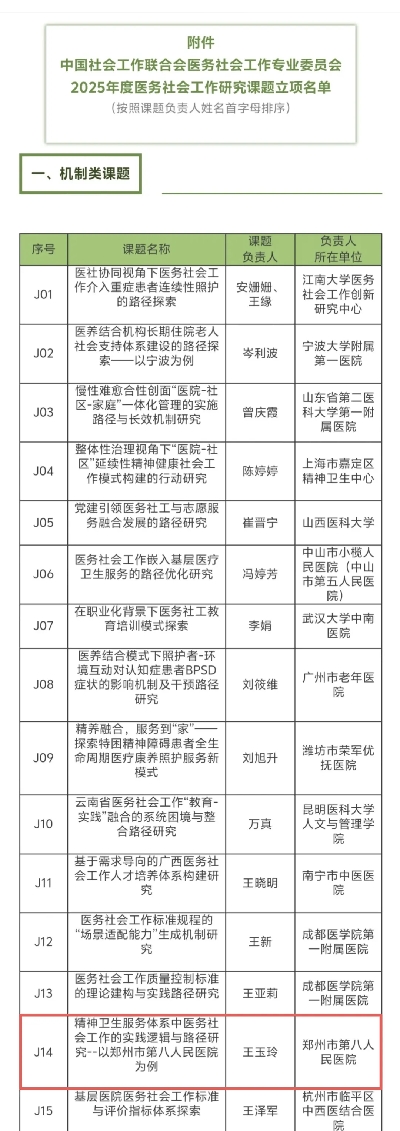 近日,中國(guó)社會(huì)工作聯(lián)合會(huì)醫(yī)務(wù)社會(huì)工作專業(yè)委員會(huì) 2025年度醫(yī)務(wù)社會(huì)工作研究課題,經(jīng)申報(bào)、資格審查、專家綜合評(píng)審、主任辦公會(huì)審核四個(gè)環(huán)節(jié)嚴(yán)格篩選,鄭州市第八人民醫(yī)院申報(bào)的課題《精神衛(wèi)生服務(wù)體系中醫(yī)務(wù)社會(huì)工作的實(shí)踐邏輯與路徑研究——以鄭州市第八人民醫(yī)院為例》,成功入圍擬立項(xiàng)公示名單。