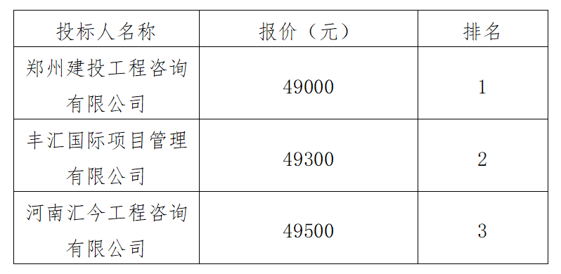 根據(jù)各投標(biāo)單位的投標(biāo)文件,評(píng)選小組成員根據(jù)綜合評(píng)分進(jìn)行了評(píng)選,最終結(jié)果已經(jīng)產(chǎn)生,中標(biāo)單位為鄭州建投工程咨詢有限公司,報(bào)價(jià)金額:49000元。