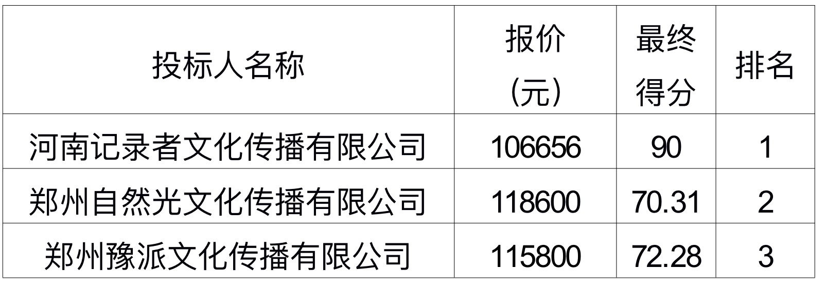 根據(jù)各投標單位的投標文件,評選小組成員根據(jù)綜合評分進行了評選,最終結果已經(jīng)產(chǎn)生,中標單位為河南記錄者文化傳播有限公司,報價金額:106656元。