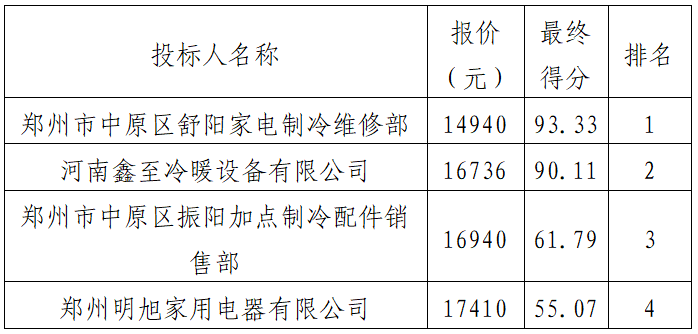 評選小組成員根據綜合評分進行了評選,最終結果已經產生,中標單位為鄭州市中原區(qū)舒陽家電制冷維修部,報價金額:14940元。