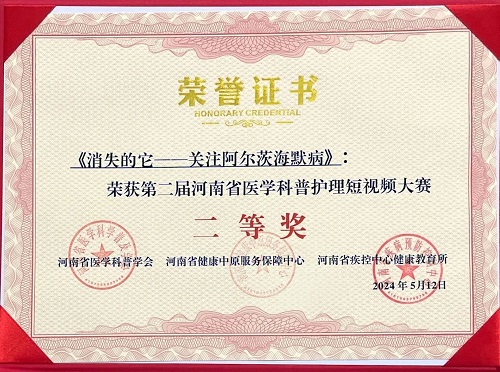 5月8日下午,在第二屆河南省醫(yī)學(xué)科普護(hù)理短視頻大賽頒獎(jiǎng)典禮中,我院科普作品《消失的它——關(guān)注阿爾茲海默病》從全省442家單位的2691件初賽科普作品中脫穎而出,成功入圍83件決賽作品。經(jīng)過激烈角逐,最終榮獲本次大賽二等獎(jiǎng),取得第7名的好成績。