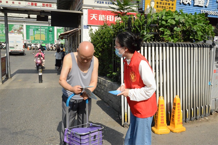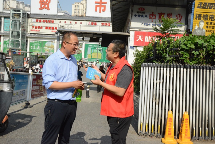 在繁忙的鄭密路農貿市場,我院志愿者身穿紅馬甲,頂著烈日、冒著酷暑,熱情地向進進出出的居民群眾分發(fā)《條例》宣傳冊、讀本,講解《條例》知識內容,號召來往群眾文明出行、合理消費、低碳生活,大力宣傳《條例》,使在場群眾對《條例》內容有了更深層次的了解和認識。市民群眾紛紛表示,將積極響應號召,從點滴小事做起,自覺踐行文明行為,遵守《條例》內容,做文明有禮好市民。