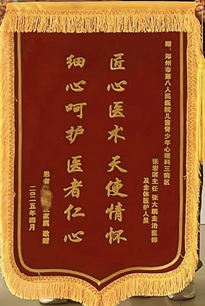“真的沒有想到在八院治療后,我女兒又能蹦蹦跳跳了……”4月15日,伴隨著家長(zhǎng)的喜悅和感激,一面寫著“匠心醫(yī)術(shù) 天使情懷 細(xì)心呵護(hù) 醫(yī)者仁心”的錦旗送到了我院兒童青少年心理科張巖濱主任和張大鵬醫(yī)生的手上。