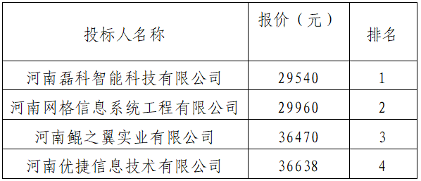 根據(jù)詢(xún)價(jià)最低價(jià)中標(biāo)原則,河南磊科智能科技有限公司以最低價(jià)中標(biāo),報(bào)價(jià)金額:29540元。