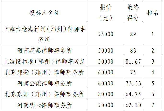根據(jù)各投標(biāo)單位的投標(biāo)文件,評選小組成員根據(jù)綜合評分進(jìn)行了評選,最終結(jié)果已經(jīng)產(chǎn)生,中標(biāo)單位為上海大滄海新閔(鄭州)律師事務(wù)所,報(bào)價(jià)金額:75000元。