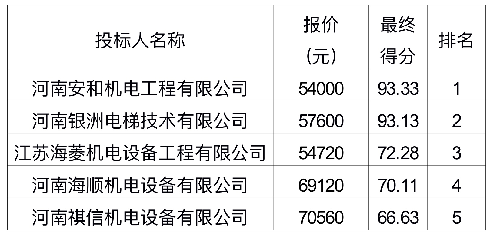 根據(jù)各投標單位的投標文件,評選小組成員根據(jù)綜合評分進行了評選,最終結果已經產生,中標單位為河南安和機電工程有限公司,報價金額:54000元。