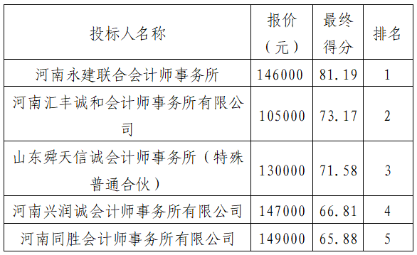 評(píng)選小組成員根據(jù)綜合評(píng)分進(jìn)行了評(píng)選,最終結(jié)果已經(jīng)產(chǎn)生,中標(biāo)單位為河南永建聯(lián)合會(huì)計(jì)師事務(wù)所,報(bào)價(jià)金額:146000元。