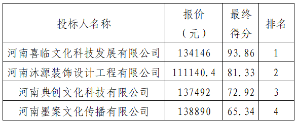 評(píng)選小組成員根據(jù)綜合評(píng)分進(jìn)行了評(píng)選,最終結(jié)果已經(jīng)產(chǎn)生,中標(biāo)單位為河南喜臨文化科技發(fā)展有限公司,報(bào)價(jià)金額:134146元。